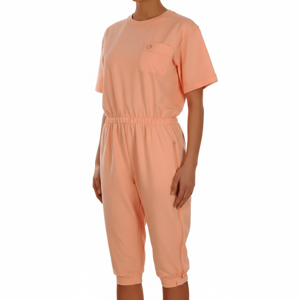 يمنع الزر والحماية المطاطية في بداية ونهاية السحاب خلع الملابس بشكل مفاجئ وغير مرغوب فيه، مما يزيل الصعوبات التي يواجهها المريض أثناء العناية اليومية بالنظافة وتغيير الملابس الداخلية.