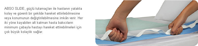 The ABSO Slide Transfer Pad is a product designed to assist in moving bedridden patients. Its strong handles on both sides allow for easy and safe movement or repositioning of the patient in bed. Thanks to its base that slides in both directions, it facilitates patient movement with minimal effort for caregivers, thus reducing the workload on the caregiver.